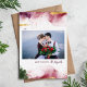 Modern custom printed Christmas photo cards with a simple DIY template for customization. This artsy design has an abstract paint splatter background in shades of burgundy, green and gold. Add your family photo, personal greeting, names and the year. Use the design tools to edit the fonts and colours. Reverse side has space to add more photos and text.