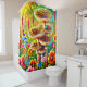 This shower curtain has an artsy mushroom scene on it.