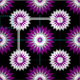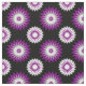 Fabric with a seamless modern geometric flower pattern in the colours of the asexuality pride flag; a black, grey, white, and magenta/purple ace pride design, on a black backgound
