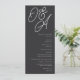 A beautiful typography based wedding program card featuring your initials in oversized script lettering at the top, in tone on tone shades for a watermark effect. Personalize with your ceremony details beneath, and customize the back with your wedding party. Our Ash colorway makes a classic statement with crisp white lettering on a soft black background.