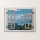 Faux Window Korea Shoreline Ocean Misty Blue Asian Mountains is a beautiful photo in a fake wooden frame that has depth and colour contrast.