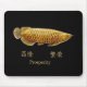 The arowana is an elegant fish from prehistoric times. It is covered in bony plates and is a very graceful swimmer. It is considered a symbol of luck and prosperity in Asia. The Chinese symbols for prosperity are below the fish design here.