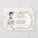 Beautiful baby boy in white & gold suit. Invitation background is white satin with a gold and silver glitter frame and bow embellishment. Back is adorned with gold flower pattern & gold ribbon on a white satin background.