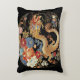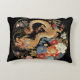 This throw pillow features an Asian style dragons surrounded by flowers on a black background. The design was created with the help of AI.