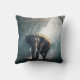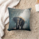 A pillow with a photograph of an Asian elephant with rounded ears standing in a forest clearing looking towards the viewer with sunlight streaming down through the canopy of trees.