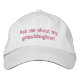 Cool gift for the proud grandpa or grandma with "Ask me about my granddaughter!" on an embroidered hat. Great Father's Day and Mother's Day gift ideas! Easy to customize the text.