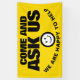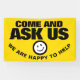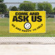 Ask us we are happy to help, slogan smile customer service client liaison and interaction encouragement banner. Let your customers or the public know you are available to help out with questions and customer service with this bright yellow, black and white ask us banner. Background colour can be changed to your own company colours if required currently bright yellow. Other matching items are available. Designed by www.mylittleeden.com