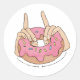 This sticker is printed with a hand-drawn design featuring a delicious pink frosted doughnut along with its ASL sign.