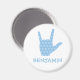Customize this magnet with a name or any text. Design features an ASL (American Sign Language) "I love you" sign with a blue dots pattern.