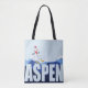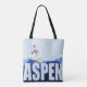 Fun Aspen Colorado themed all over print tote bag done in blue with graphics of snow covered mountains, a snowman skiing, and graphic text reading ASPEN. Customize to add more text to this great travel or all purpose tote bag.