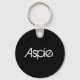 Metal tag hanging from keychain has stylish "Aspie" in white.