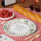 Autour d'un cadre rond central, il y a des fleurs roses douces accentuées par des feuilles vertes et de petites fleurs blanches. L'arrangement est symétrique, créant une apparence harmonieuse. Le fond blanc amplifie la beauté des détails floraux, rendant le design charmant et raffiné.