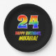 Cette conception amusante, colorée et joyeuse d'anniversaire de la plaque de papier avec un grand nombre de "24" et le message "HAPPY BANTHDAY", tous deux avec un dégradé de arc-en-ciel coloré inspiré couleur motif, avec un nom personnalisable jaune gras. Il a un arrière - plan de couleur noire. Des plaques de papier à thème d’anniversaire comme celle-ci pourraient être utilisées pour célébrer le 24e anniversaire de quelqu’un. [~Z0000488]