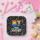 This fun and exciting birthday paper plate design features a large number “57” with a rainbow spectrum gradient inspired pattern, along with the message “Happy 57th Birthday,”, and a custom name. The background features an exciting and colorful pattern having many star shapes with different sizes and colors. Joyful birthday themed paper plates like this might be used at a party in celebration of somebody’s fifty seventh birthday. [~Z0000582]