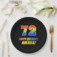 Cette conception joyeuse, colorée et amusante de plaque de papier à thème d'anniversaire comporte un grand nombre de "72" et le message "HAPPY BANTHDAY", tous deux ayant un dégradé arc-en-ciel de couleur motif inspirée, ainsi qu'un nom jaune audacieux modifiable. Il a un arrière - plan de couleur noire. Des plaques de papier sur le thème de l’anniversaire comme celle-ci pourraient être utilisées lors d’une fête célébrant le soixante-douzième anniversaire de quelqu’un. [~Z0000488]
