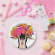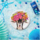 Il présente une de mes peintures numériques d'une chèvre avec des fleurs sur la tête.