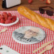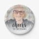 These custom 90th birthday paper plates feature the guest of honor's photo and birthday, along with the word "Cheers" in elegant black calligraphy script. A white screen helps make the text pop. A great way to celebrate someone who's turning ninety!