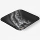 Un adolescent skateboarder se promène dans une pente raide à la traîne derrière lui, sur le noir, dans une aura lumineuse et pétillante.