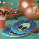 Une tête alien verte avec de grands yeux noirs ovales et une petite fente noire pour une bouche. L'arrière - plan est un dégradé foncé à bleu clair, parsemé d'étoiles blanches.