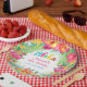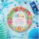 Cette plaque d'anniversaire amusante Aloha luau comprend des fleurs tropicales lumineuses, des flamants roses et vos informations.  Fournitures de fête correspondant disponibles dans mon magasin. Design©Rosalind Moore, Cherry Lane Designs