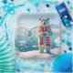 Un ours polaire portant un foulard rayé rouge et blanc se dresse sur un paysage glacé, tenant ses pattes en forme de coeur