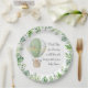 Plaques de papier-douche Safari sur le thème du genre neutre ou bébé garçon présentant une bulle d'air vert aquarelle avec de mignons animaux Safari : éléphant, girafe, lion, singe et zèbre entouré de feuilles verdoyants avec message de remerciement sur le côté.