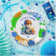 Nom personnalisé et plaques d'anniversaire d'âge. Joli petit garçon anime jouant à des jeux vidéo avec un arrière - plan de peinture bleu, orange et vert éclaboussant fait dans un aquarelle d'air illustration.