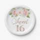 Douces assiettes de fête de 16 ans avec des fleurs d'aquarelle rose pâle et du texte en or rose.