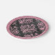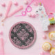Cette plaque en papier d'Halloween rose et noir présente un design damassé rose victorien autour du bord avec un motif noir et rose coordonné avec de minuscules crânes au centre.