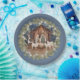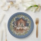 Cette plaque traditionnelle en papier de Noël présente une image de nativité du bébé Jésus dormant dans une crèche avec Marie et Joseph au centre. La crèche est entourée d'une couronne de baies blanches. L'arrière - plan a une couleur bleue coordonnée.