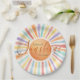 Vous cherchez un thème de baby shower mignon ? Découvrez ces assiettes les années 70 Boho Sun 'Little Ray of Sunshine' Baby shower Party. Elles sont ornées d'un soleil arc-en-ciel d'aquarelle peint à la main dans des pastels doux et feutrés et le message "Notre petit rayon de soleil est en route !" Faites une fêtrement de baby shower !