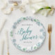 Une jolie et délicate assiette de baby shower avec de délicats feuilles d'eucalyptus à l'aquarelle dans le bleu et le vert doux. L'expression "baby shower" est dans le style calligraphie moderne police turquoise, personnalisée avec le nom de la future mère et date en noir sans serif.