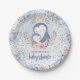 Plaque en papier baby shower présente maman et bébé pingouin sur un arrière - plan bleu et des arrosages de fausse parties scintillant. Personnalisez avec un nom.