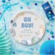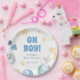 Fournitures de baby shower Party avec "oh boy!", nom de l'événement et date encadrée par des illustrations aquarelles d'étoiles, de planètes et de fusées. Coordonnée avec la collection Out of this World trouvée dans la boutique Adore Paper Co. Zazzle.