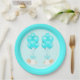 Plaques de baby shower créatives jumelles avec de mignons jumeaux sous des bouquets de ballons bleus.