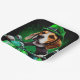 Un ami en fureur derrière les guidons d'une moto verte brillante, portant une tenue verte de la Saint Patrick qui fait tourner la tête. Le chien est habillé d'un ensemble festif, avec une cravate arc-en-ciel verte et un chapeau haut assorti qui se trouve doucement au-dessus de la tête. Le costume présente des motifs complexes de shamrocks et de leprechauns, ce qui indique clairement que ce chien est prêt à célébrer la Saint Patrick avec style.
