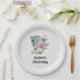 Plaques en papier d'anniversaire avec une belle illustration représentant un portrait léopard gris, noir et blanc. Ce bel animal est entouré d'un bouquet de fleurs tropicales. Élégant, exotique et joli.
