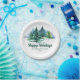 This beautiful custom business holiday party paper plate features gorgeous green Christmas trees in a winter landscape above your customized company name and Happy Holidays. Personalized holiday decor for a corporation or family.