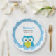 Adorable bébé garçon douches plaques en papier avec un grand hibou souriant. Consultez les produits de baby shower correspondants, y compris les invitations dans notre magasin.