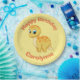 Un adorable bébé brontosaurus "Cutisaurus", jaune avec taches oranges et grands yeux bleus. Personnalisez avec le nom de votre enfant.