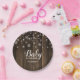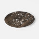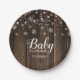 Plaques de papier baby shower rustique à thème hivernal. Ce design branché comprend des lampes à cordes et des flocons de neige sur un arrière - plan en bois foncé.