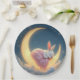 Un lapin blanc moelleux est enveloppé doucement dans une couverture rose, reposant paisiblement sur une lune de croissant brillante dans un ciel nocturne onirique. Peut être utilisé pour une douche bébé fille.