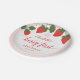 Une mignonne fraise 1er anniversaire plaques de papier fête. Le design présente des fraises rouges, des vignes vertes et des fleurs blanches sur un arrière - plan rose clair avec une police de script de calligraphie.