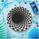 A tunnel-like optical illusion is created using a black and white checkered pattern, giving a dizzying sense of depth
