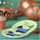 Profitez d'une fête, d'une réunion ou d'un autre événement avec ces assiettes jetables "Party Scottie" amusantes et fantaisistes. Customisez avec d'autres mots, un anniversaire ou un autre événement ou une célébration, ou personnalisez avec le nom de votre chien. L'amour de votre chien brillera avec cette unique d'une assiette en papier avec un mignon chien en terrier noir habillé pour l'occasion. Ce Scottie Terrier noir et fantaisiste porte un manteau de pull bleu avec des étoiles bleues tonales et un collier rouge. Une boule verte citron et turquoise est derrière le Scottie et un gros os blanc de chien est à sa patte avant. L'arrière - plan est un motif rayé vert citron pour faire une table de fête en papier jetable design, tendance et personnalisée. Trois fleurs bleues turquoises turquoise sont au-dessus du chien. Ce chien mignon, câlin et tendance est l'art original de Phyllis Dobbs et fera fondre le coeur d'un amoureux des chiens. Cette Scottie fait partie d'une série de 6 Scotties et toutes sont entièrement personnalisables pour en faire la vôtre ! Coordonner avec les produits correspondants.