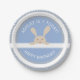 Bleu clair, rond, avec bordure blanche et brune, avec un treillis blanc. Une tête, un visage et des pattes de lapin bronzé se tiennent sur un ruban blanc en dessous. Les textes modèles à droite vous permettent de customiser pour un usage personnel. Idéal pour des fêtes d'anniversaire pour enfants ou un événement de Pâques.