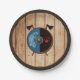 Un bouclier Viking et des haches de bataille croisées superposées sur une image arrière - plan murale en planches de bois. Le bouclier est noir sur le côté gauche avec une empreinte rouge à droite. L'autre côté du bouclier est bleu avec un aigle blanc de style celtique-norse. Customisez en ajoutant votre propre texte. Vous pouvez également modifier les couleurs des anneaux de bordure ou les enlever. Les boucliers viking variaient. J'ai basé cela sur des exemples historiques. Les boucliers étaient parfois recouverts de cuir, comme celui-ci. Par conséquent, la peinture est imparfaite permettant de voir une pointe de cuir sous-jacent. Les bords en fer étaient rares; j'ai opté pour le revêtement en cuir comme on l'utilisait souvent. J'ai opté pour de simples têtes de hache au lieu de la hache de barbe et des interprétations plus fantaisistes qui sont couramment employés par les artistes.