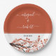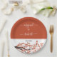Branche en terre cuite avec plaque en papier mariage de fleurs de pêche foncé. La partie supérieure est recouverte d'une bande de terre cuite et de vos noms en typographie de script tandis que la partie inférieure est de couleur blanche avec une branche en terre cuite et noire avec des fleurs de pêche foncées.