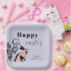 Belles assiettes contemporaines en papier pastel violet pastel avec un lapin rose illustré à la main et une silhouette abstraite florale. Personnaliser avec votre propre nom de famille