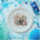 Paper plates with a vintage styled camera decorated with flowers. Pastel colors of pink, cream and green.